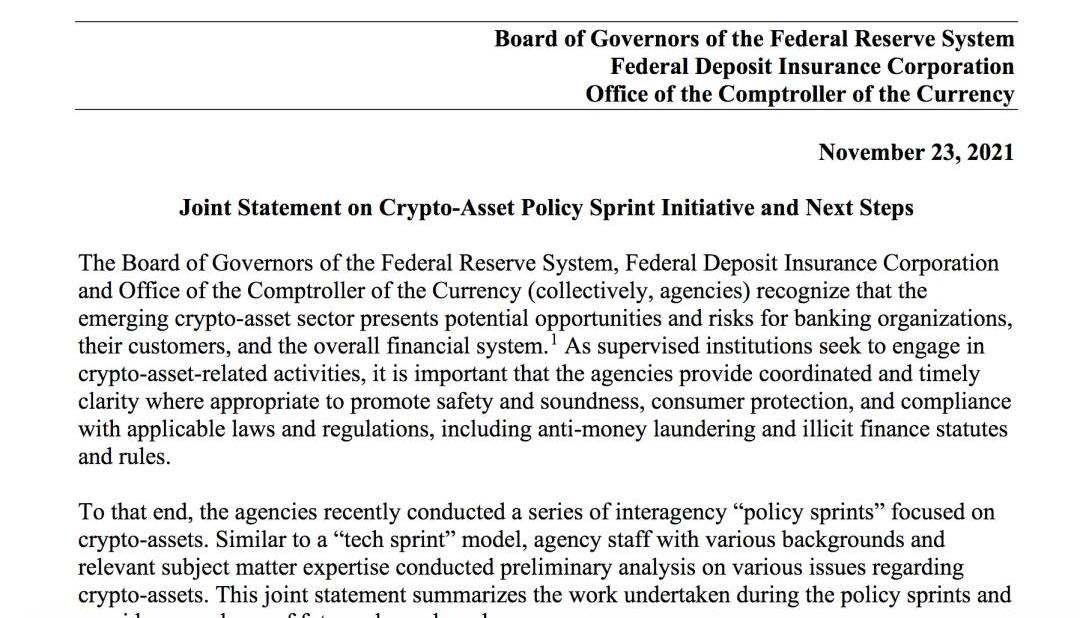 XRP/HKD-0.99%作者:MaryLiu圖片來源:網絡美聯儲系統理事會、聯邦存款保險公司和貨幣監理署周二發布了「關于加密資產政策沖刺倡議和后續工作」的聯合聲明。