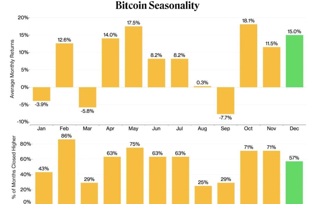 下圖顯示了比特幣每月的平均回報。通常情況下,BTC在第四季度會獲得正回報,然而,根據季節性數據,BTC的上漲空間可能有限,因為1月份往往會產生負回報。