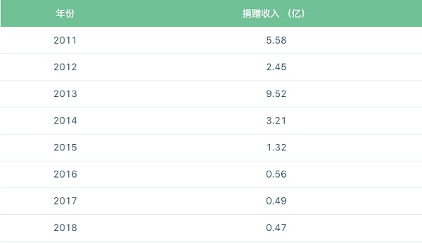 「不信任」影響多嚴重?我們通過 2011 年「郭**事件」發生后的各類數據進行說明。根據《 2011 年度中國慈善捐助報告》核心數據。受郭美美影響最嚴重的機構,該體系 2011 年接收社會捐贈約 28 .67 億元,比 2010 年減少 59% 左右。與該機構的受捐驟降形成對比,2011年,我國社會捐贈總量共計約 845 億元,捐贈總量較2010年下降 18.1%。該事件形成的連鎖反應并未終止,繼續看 2012 年。《 2012 年中國慈善捐贈發展藍皮書》,全國社會捐贈總量約有 700 多億元,與 2011 年的 845 億元相比,降幅17% 左右。觀察這個最受影響的機構總會的公開年度審計報告數據,數字能說明一切。捐贈收入如下: