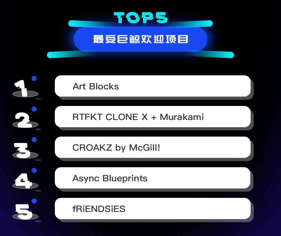 最受巨鯨歡迎項目排前五的分別是:ArtBlocks、RTFKTCLONEX+Murakami、CROAKZbyMcGill!、AsyncBlueprints、fRiENDSiES。