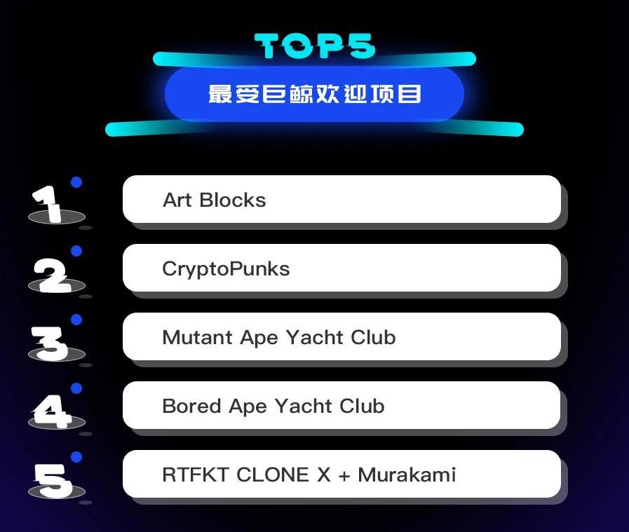最受巨鯨歡迎項目排前五的分別是:ArtBlocks、CryptoPunks、MutantApeYachtClub、BoredApeYachtClub和RTFKTCLONEX+Murakami。