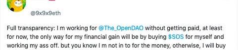 據悉,OpenDAO是NFT生態去中心化組織@721DAO發起的項目,其主要發起人、貢獻者、資深NFT玩家「9x9x9」發起的項目,9x9x9也發推證實了這一點,同時,721Dao也在社群中表示即將投資1億美元至SOS生態建設之中。