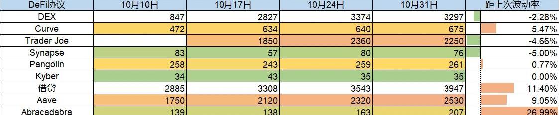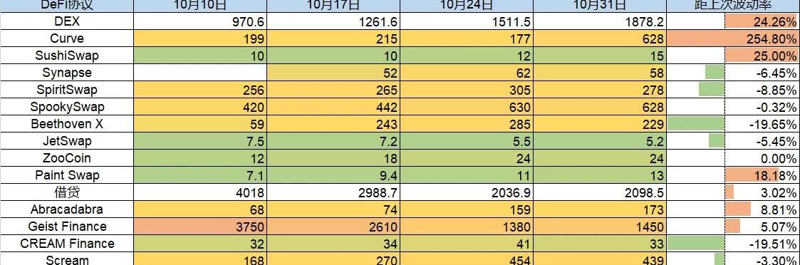來源:DeFiLlama從整體表現情況來看,Fantom生態的Curve出現較大增量使整體TVL上升幅度較大;除此之外經過篩選,ETH鏈上表現較好協議有Abracadabra,其代幣SPELL本周上漲超30%;Solana鏈上表現較好有Solend,于11月1日在https://ido.solend.fi/上進行IDO。去中心化交易所情況