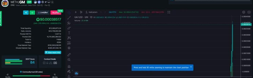 數據網站dextools.io顯示,截至11日下午3點50分,Uniswap的GM/ETH流動性池子TVL在1200萬美元,其中ETH1304枚。日交易量多少呢?4377萬美元。如果以該數據計算,它的總市值就是2億美金。就是這么兇。以太坊瀏覽器顯示,持有該幣的地址總量在6384個。擁有量第一的地址占比4.3319%,該地址最早用1個ETH買入了將近450億枚,目前持有430億枚。第二的地址占比2.2203%,第三的地址占比1.561%。被標記為抹茶交易所的地址占比排第五,0.9515%。2