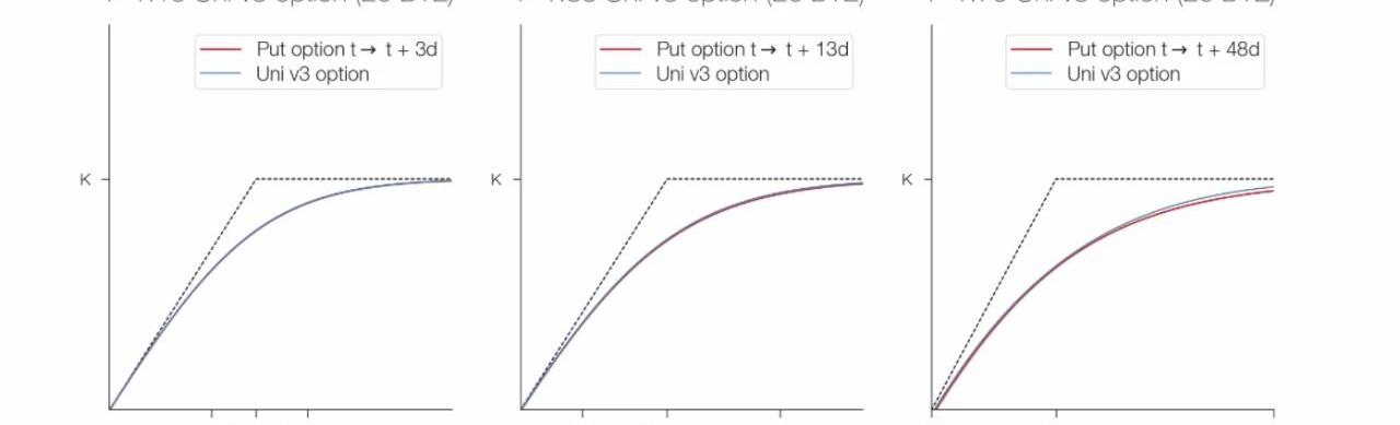 我們能讓這個表達式更簡單嗎?Univ3頭寸值的表達式相當復雜。幸運的是,我們可以大大簡化分析。正如我關于在Uniswapv3中創建永久期權的文章所示,一個具有范圍因子r的Univ3LP頭寸的良好近似是在時間T_r的常規看跌期權,其中