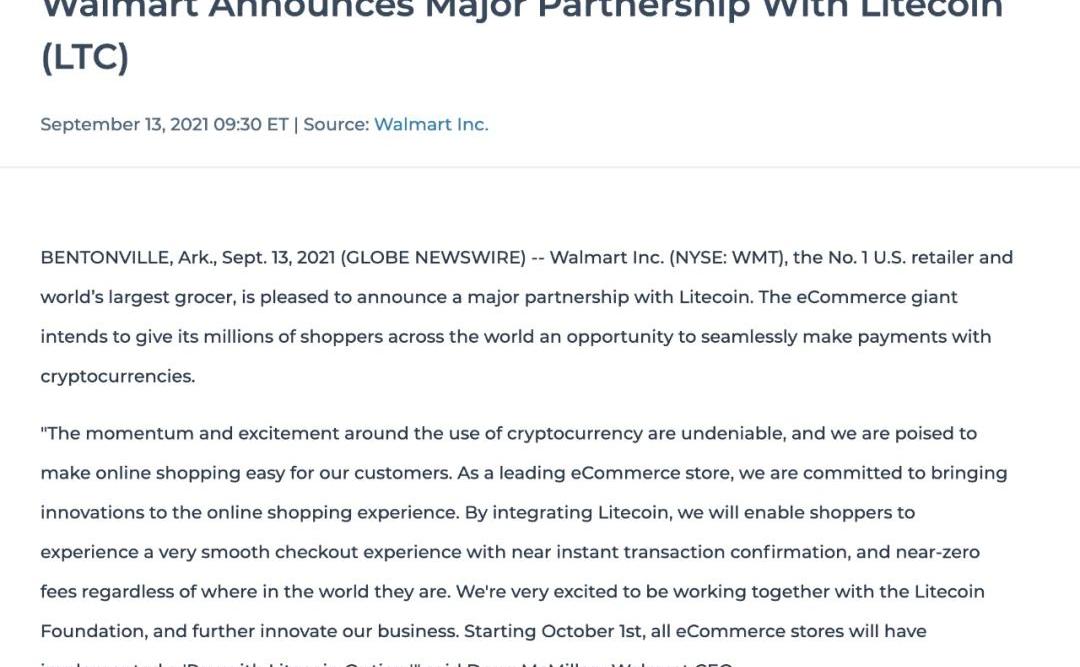 9月13日,加密貨幣市場持續下跌的一天,黑手正式開工,在Globenewswire上發布了“沃爾瑪宣布與萊特幣進行合作”的PR稿件。