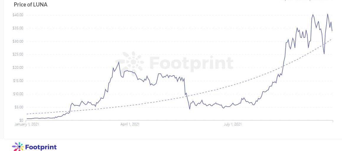 穩定幣市值數據來源:FootprintAnalytics通過FootprintAnalytics的數據看到,目前市場上常見的穩定幣里,UST的市值已排名第四,而排名第一、第二的USDT、USTC為中心化穩定幣,第三名的Dai也不能算是完全去中心化的穩定幣,去中心化的穩定幣UST可以算是名列前茅,這與Terra打通線下場景密不可分,與其他穩定幣相比可謂是最“有用”的穩定幣了,它給“虛幻”的區塊鏈世界加載上了實實在在的使用場景,也因此反哺體現到其自身市值。代幣Luna四個月增長416%,躍居公鏈代幣前五Luna是Terra鏈的PoS質押代幣,因此Luna的價格將越高,Terra的安全性越高。然而對于其他鏈來說,鏈的代幣通過交易獲得價值,無法將價值捕獲延伸至域外。自Terra今年4月啟動主網,其代幣Luna有一小波上漲,受“519”事件下跌后,7月逐漸重新拉高,8月發生大幅上漲,自6月初的6.55美元到截稿日已上升約416%,但從FootprintAnalytics的數據看到目前Luna已是各公鏈代幣中價格排名第五的代幣,雖然其幣價與第4名的AVAX相差一半,但其交易量已與AXAX不相上下,甚至還遠超MATIC,可以看出這種打通線上線下具有強貨幣屬性的公鏈更加具有交易屬性。