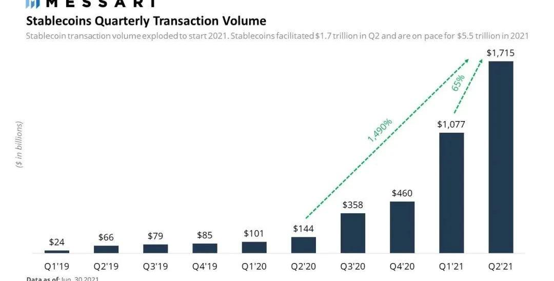 穩定幣是與任何基礎資產(如國家貨幣或貴金屬,如黃金)掛鉤的數字貨幣。這給了穩定幣在安全性、透明度和隱私方面的自由。自2019年推出以來,穩定幣的交易量一直在增長。到2021年4月,這個數字從每天數十億美元上升到1000億美元的中值,在4月中旬創下了2500億美元的紀錄。不久前,我們目睹了一場“穩定幣入侵”。在全球范圍內,大約有200個穩定幣已經發布或正在開發中。然而,它們突然增長的一個原因是它們可靠的點對點(P2P)交易環境。它消除了使用比特幣等不穩定加密貨幣進行交易的需要。在最近的報告中,Messari透露,穩定幣的活動在2021年第二季度大幅飆升。