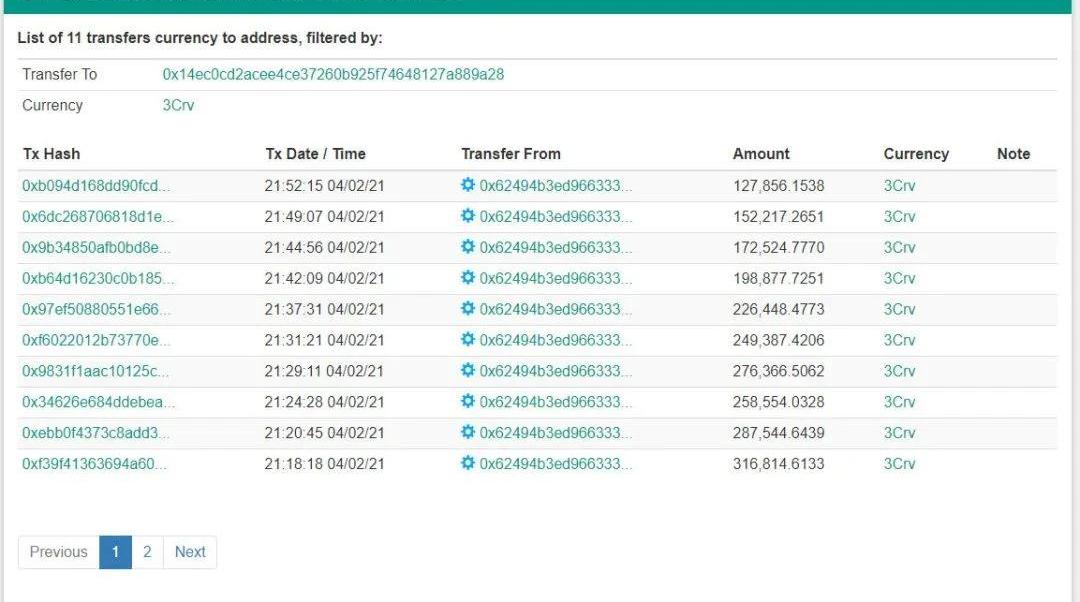 利用方法:閃貸損失資金:1100萬美元Yearn.Finance成為大規模閃貸攻擊的受害者,總損失超過1000萬美元。攻擊者獲得1.7M的USDT,513K的DAI和506K的3CRV。下面的截圖描述了3CRV攻擊者在每筆交易中獲得的利潤。