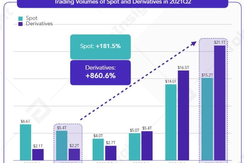 永續合約屬于衍生品的一種,根據TokenInsight報告,衍生品的交易量在20年Q4開始就整體超越了現貨,并在21Q2保持了更加迅猛的增長。