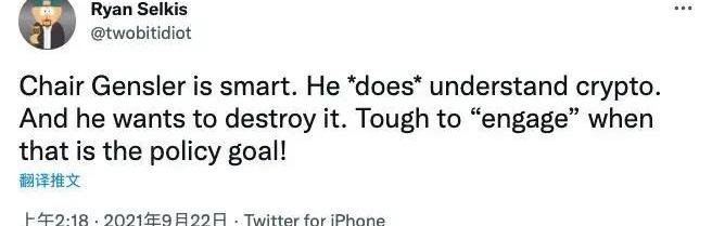 9月3日,華爾街日報就爆出美國SEC已對Uniswap的主要開發商UniswapLabs展開調查。據悉,SEC的執法官正在搜集信息,研究用戶如何與平臺互動,以及Uniswap的市場營銷方式。這表明SEC已對DeFi領域的發展進行了密切關注。DeBank數據顯示,截止2021年9月DeFi領域的總鎖倉量已超過1000億美元。9月17日,彭博社再次撰文表示,美國財政部官員認為由Tether和其他穩定幣是的目前最緊迫的風險,美國監管機構認為穩定幣繞過監管漏洞,并準備對穩定幣進行更嚴格的監管。9月21日,SEC主席GaryGensle此次接受《華盛頓郵報》專訪再次對穩定幣進行嚴厲批評:這些穩定幣就好像賭場里的撲克籌碼一樣,放在賭場的賭桌上。對于最近監管收緊,加密衍生品交易所FTX創始人SBF在接受彭博社采訪時表示,更嚴格的加密交易所監管可能會對投資者產生積極影響,但另一方面Sam也表示:美國禁止穩定幣將是“可悲的”,其他類型的監管干預措施是有益的。Messari創始人RyanSelkis也表示:SEC主席Gensler很聰明,他“確實”了解加密行業。但當政策目標想摧毀它時,我們的確很難“參與”!