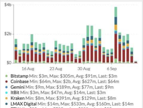 BTC現貨價格,來源:skew自9月5日至9月12日11:00點,BTC下跌4534點,下跌幅度達9.09%,9月7日暴跌期間,單日最高下跌達9700點,是繼“5.19”之后對行情的再一次沉重打擊,市場活躍度可能重新降低到降低水平。BTC交易量