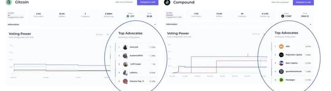頂級治理參與者的排名像這樣的聚合“DAO分數”可以作為“協議家”在成為社區領導者時參考的數據點。潛在的委托人可以查看候選人的個人資料,了解他們過去的投票方式、他們采取的哪些舉措等。7