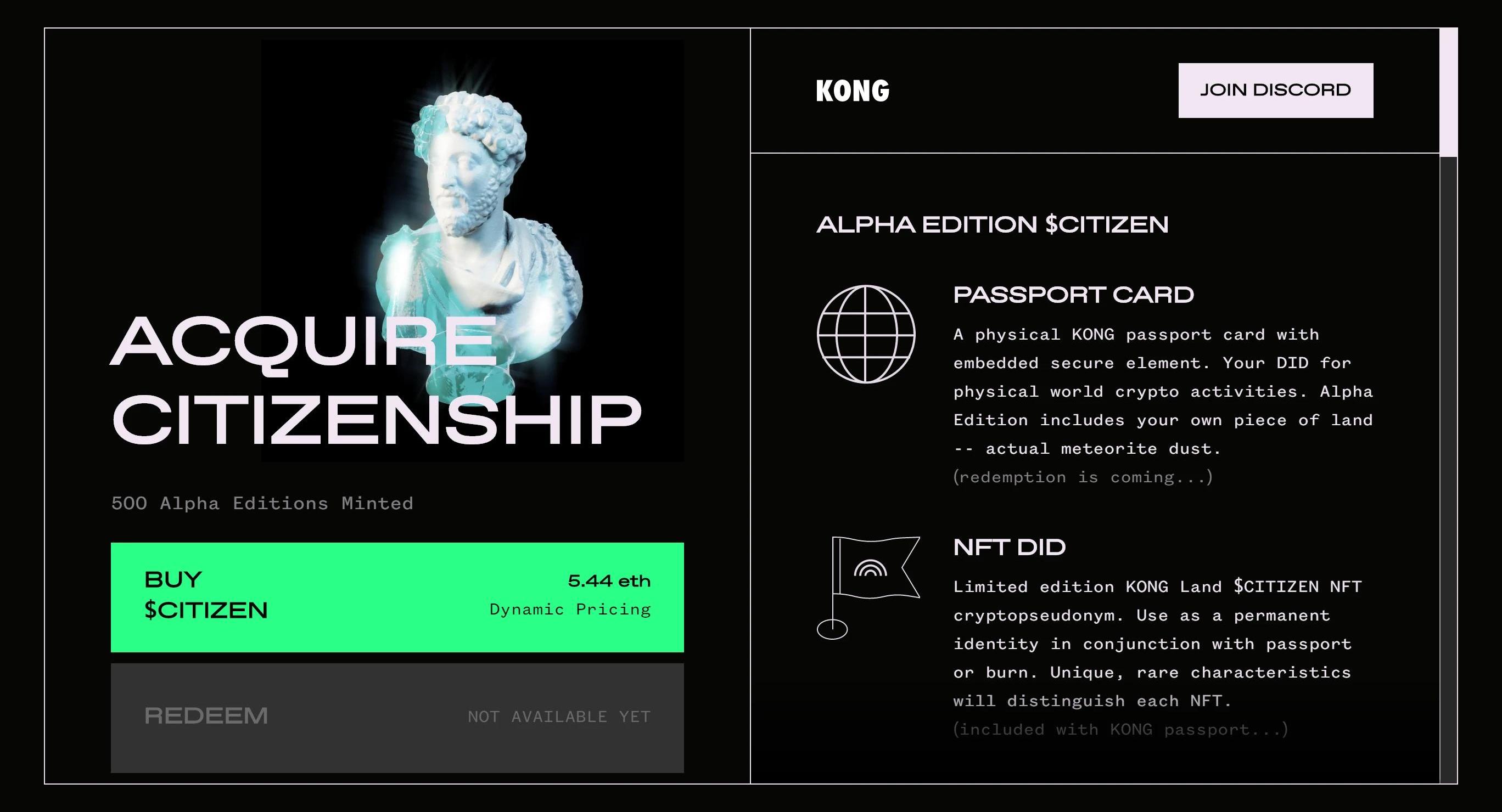 8月29日,上市公司第九城市宣布將推出NFT平臺NFTSTAR,預計在今年第四季度正式上線運營。另外,前DapperLabs運營副總裁GaganPalrecha已受邀加入NFTSTAR,擔任首席運營官。創新NFT應用KONG.Land8月26日,實驗性「加密國家」KONGLand開放500個創始公民身份購買資格,創始公民身份代幣為CITIZEN,創始公民會獲得一個實體護照、一個NFT以及加入Discord的資格。KONGLand是一個實驗性的「加密國家」,其使命是通過在全球范圍內采用其公共產品SiLos,將物理世界與數字元世界連接起來。像其他國家一樣,KONGLand有公民身份要求、獨特的文化、工作政府等等。在成立之初,KONGLand將作為一個云端國家存在,其公民共同為穩定幣、身份、時尚和藝術等不同行業的項目出口加密資產。SiLo芯片將提供給那些向KONGLand庫房提供部分治理代幣的項目。有了足夠的資金,KONGLand將繼續投資于安全的實物加密資產研究,探索新的商品出口,以及在數字和實物領域發展加密國家的方法,以造福其公民。
