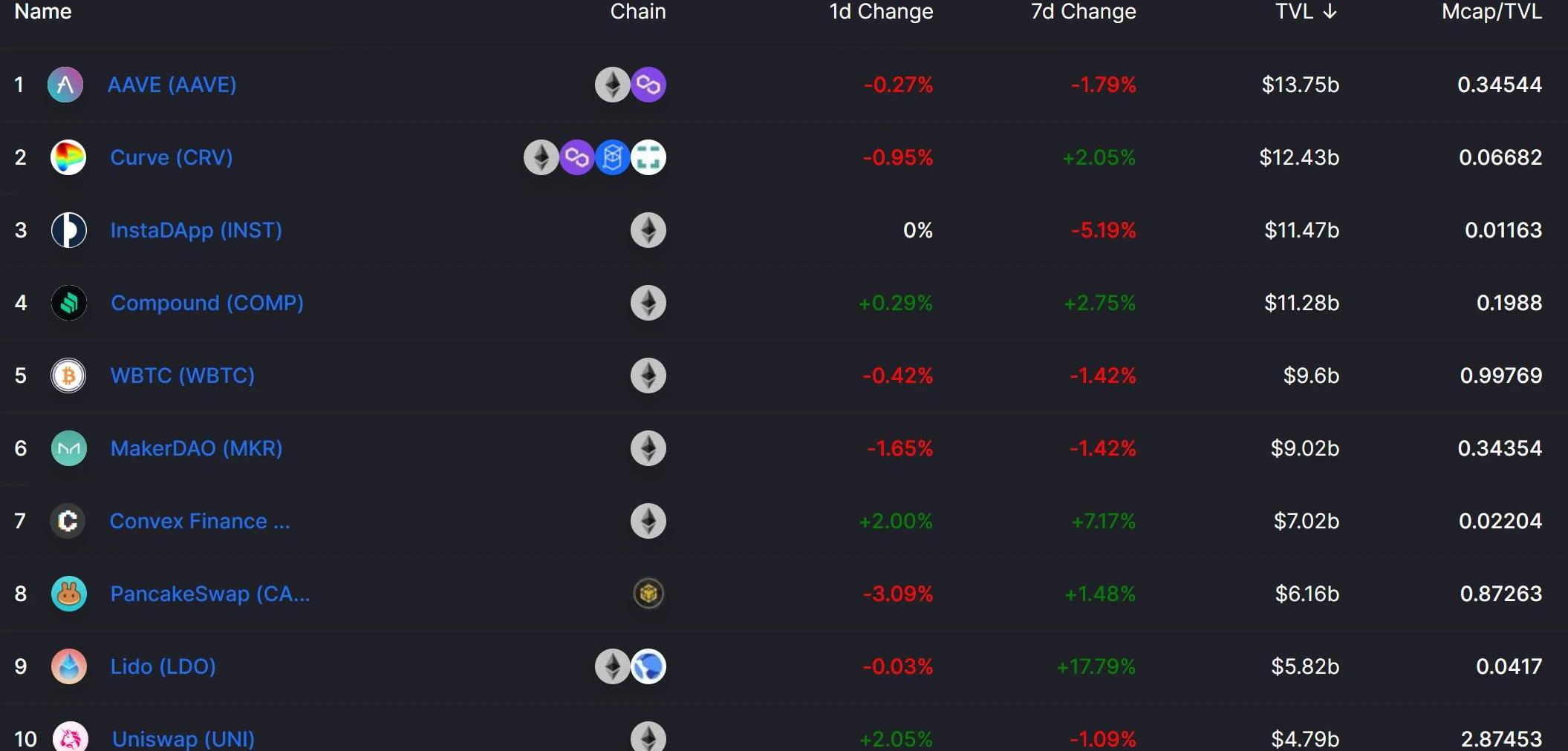 從上圖可以看出,以太坊仍然占據龍頭位置,大幅度超越其他公鏈,其中AAVE在Ethereum和Polygon兩個鏈上的總鎖倉量達到了137億美元,成為了TVL排名第一的項目。