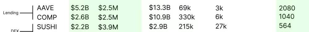 從理論上講,COMP再次表現為與AAVE的價值競爭,其30天收入相當,但占其市值的50%。請注意我們是如何在兩個去中心化的交易所(Sushiswap,Bancor)旁邊展示兩個借貸協議(Compound,Aave)的。在進行這些分析時,按類別比較項目,以反映類似的費用生成機制,以及對同一組用戶的競爭是很有用的。直接在各個類別進行比較往往不合適,而且可能會產生誤導。衡量協議現金/流動性