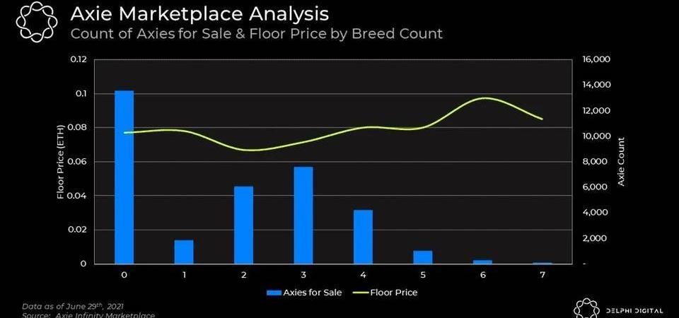 觀察到Axies單日成交量,在今年5月1日左右開始暴漲。這是由于4月28日前后,平臺正式完成了技術升級,游戲從ETH整體遷移到了自研的側鏈Ronin上。總繁殖成本=固定成本+變動成本從4月至今,固定繁殖成本經歷過3個階段。第一階段:4月AxieInfinity運行在ETH網絡上,僅需要支付GASfee,而不需要支付AXS。以4月底ETH價格和gas費計算的話,繁殖的gas費成本是:2500*0.005=12.5美元第二階段:5月初轉移到Ronin鏈上后,不需要支付GASfee,但需要支付2AXS:10*2=20美元第三階段:7月初,繁殖費用變更為4AXS,且AXS價格上漲:20*4=80美元從玩家層面來看,ETH主鏈到Ronin鏈的遷移,其實并沒有降低繁殖的成本,反而隨著AXS價格的增長,進一步推高了繁殖成本,只不過隨著Axies價格的上升,繁殖成本的占比在逐漸縮小。游戲中,根據繁殖的次數不同,支付的SLP數量不同.按照SLP的價格為0.3美元計算,每次繁殖需要支付的SLP成本從30-510美元不等。