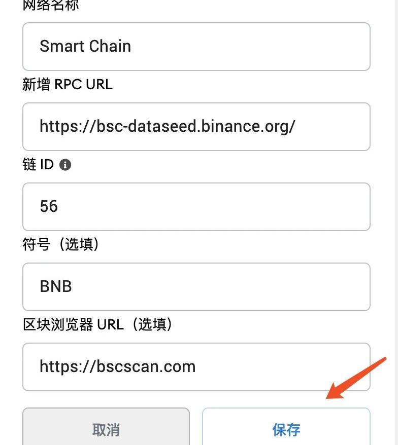 按照以下配置來填充自定義RPC表單并單擊“保存”:網絡名稱:SmartChain新增RPCURL:https://bsc-dataseed.binance.org/鏈ID:56符號:BNB區塊瀏覽器URL:https://bscscan.com