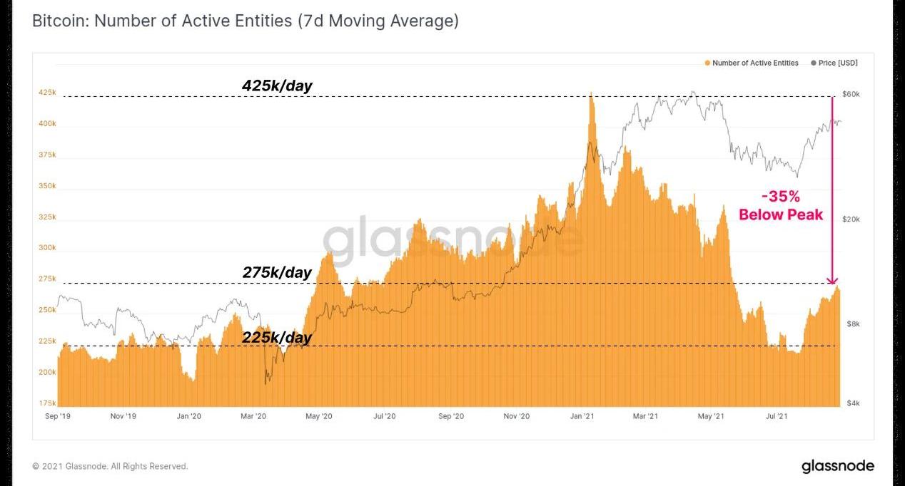 比特幣鏈上的活躍實體目前每天約為27.5萬個,仍比1月份峰值低約35%。