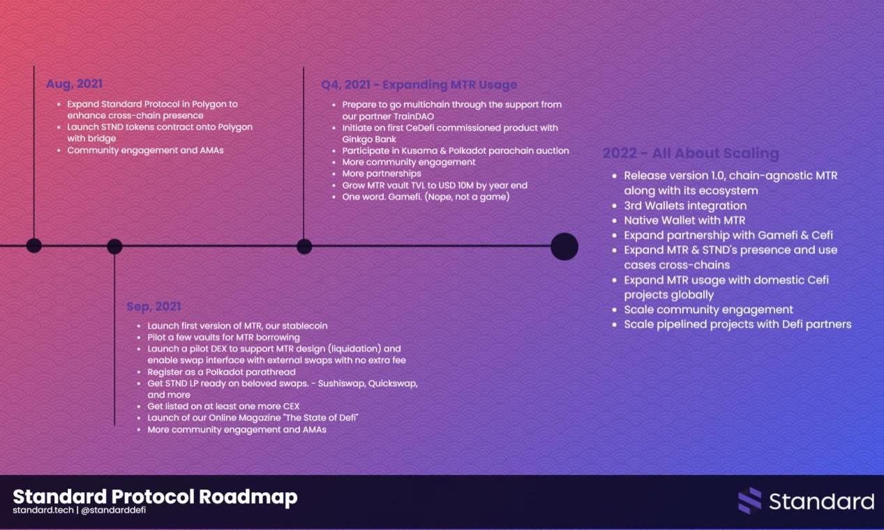 八月——月度回顧八月初,StandardProtocol獲得了PolygonDeFiforAll基金的資助。現在STND合約已完成在Polygon上的部署,接下來我們將實現STND的可遷移性。同時STND已上線Sushiswap和Quickswap。八月的進展可以總結為三方面:技術開發:1)MTR開發已基本完成,預期九月推出,2)成功部署在Polygon上,3)RococoTestnet已接近完成;市場營銷:1)舉辦多輪Trivia的Gaming活動,數千人參與;2)與GameFi項目合作,后期將結合MTR與游戲場景;使用橋在Polygon上啟動STND代幣合約;3)在非洲、越南與土耳其地區舉辦AMA;九月——重磅落地將$STND代幣遷移至Polygon有助于發布我們的穩定幣MTR。該版本將包括一個可以通過選定的、可靠的抵押品借用MTR的資金池,以及一個促進資本抵押品高效清算的DEX。我們還致力于在Polygon上頭部去中心化交易所為MTR建立必要的、帶有質押獎勵的LP,以支持其在第1天的穩定性。九月是核心產品落地的節點,它將StandardProtocol變成市場上超額抵押的穩定幣協議之一。我們計劃實現以下里程碑:推出首版的穩定幣MTR試運行幾個資金池供MTR借幣使用推出支持MTR穩定幣設計的試點DEX,并啟用與外部兌換協議的接口,無需額外費用準備好STNDLP交換—Sushiswap、Quickswap等競拍Polkadot平行鏈上線至少一個全球Tier1的中心化交易所推出在線雜志“TheStateofDefi”更多社區活動和AMA2021年第4季度—擴展場景決定穩定幣成功的不僅僅是資金池中的TVL,也是在不同維度上使用這種與美元掛鉤的貨幣的實際流通量和應用場景。StandardProtocol將與我們的韓國銀行合作伙伴GinkgoBank啟動我們的第一個CeDefi委托產品。關注Kusama和Polkadot平行鏈拍賣,我們還將與chain-agnostic橋接協議的合作伙伴TrainDAO合作,幫助我們將MTR從Polygon擴展到其他鏈,實現在Polygon之外也能釋放MTR的使用潛力。以下是我們第四季度的目標。準備通過我們的合作伙伴TrainDAO的支持進入多鏈與GinkgoBank合作推出首個CeDefi委托產品參與Kusama和Polkadot平行鏈拍賣更多社區活動與合作更多合作伙伴到年底將MTR資金池TVL增加至1000萬美元2022—加速迭代2021年是成立基金會的元年,完成了產品初代的落地與嘗試。2022年將是專注于擴展衍生StandardProtocol至更多領域與場景的一年,包括創建MTR原生錢包,以及與第三方錢包,其他Cefi合作伙伴的融合。我們還將與我們的Defi伙伴合作,以進一步豐富MTR的應用場景生態系統。到2022年底,我們將真正成為Defi和Cefi之間的橋梁。MTR及其生態系統的1.0版第三方錢包整合MTR原生錢包擴展CeFi合作伙伴擴展MTR和STND的跨鏈與多練的應用場景在全球范圍內通過各國的Cefi項目擴大MTR的使用擴展社區合作與Defi伙伴一起開拓新領域與新方向以下是我們最新路線圖。