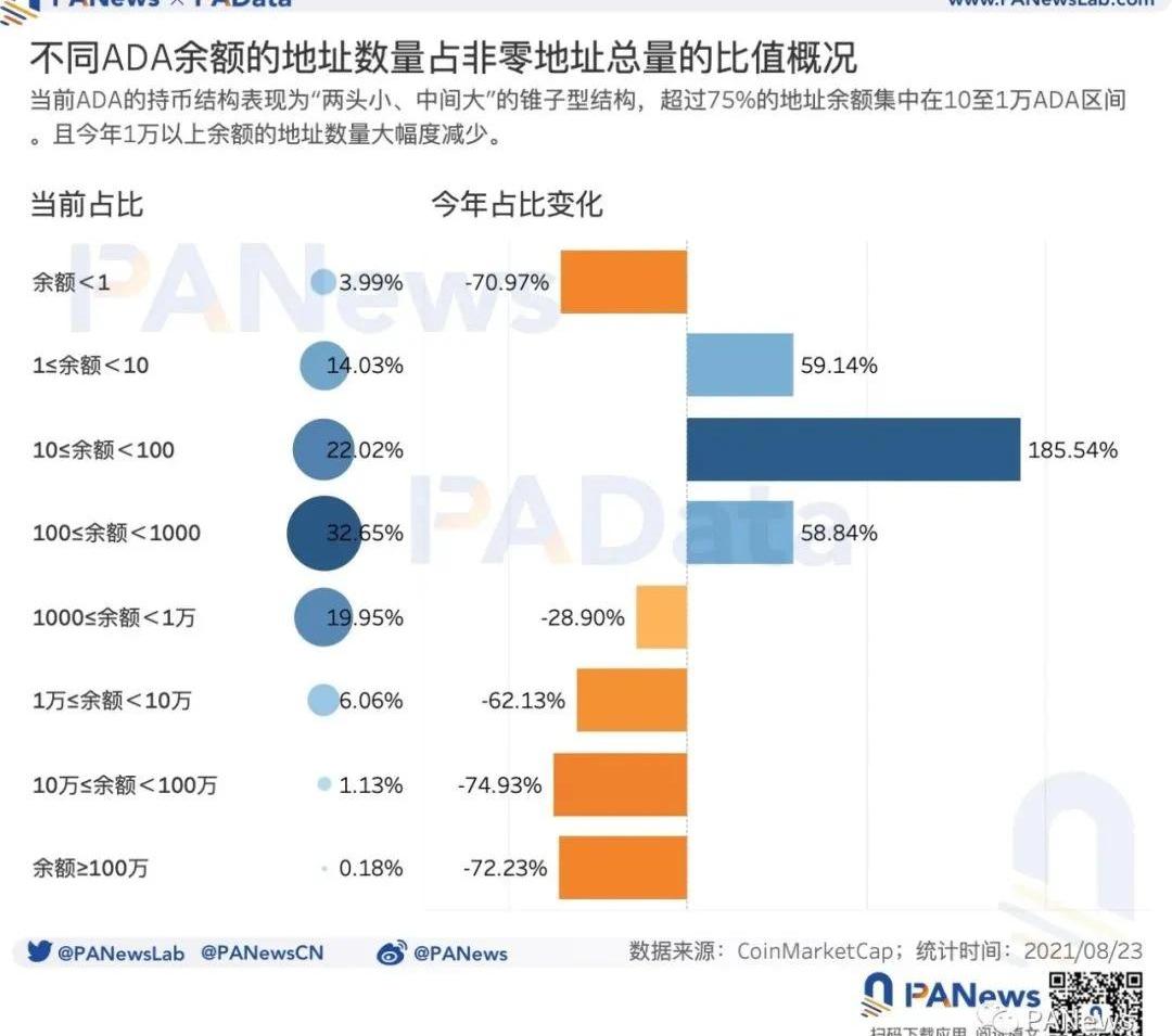 XRP/HKD-0.65%分析師|Carol編輯|Tong出品|PANews公鏈Cardano的原生代幣ADA已經成為當前市值規模僅次于BTC和ETH的第三大代幣,根據CoinMarketCap的數據,截至8月27日,ADA的市值規模達到了821.51億美元。這背后,是ADA幣價的“瘋狂”上漲。根據CoinMetrics校正后的幣價數據,今年ADA先后多次突破2美元,8月22日報收2.67美元創下歷史最高,今年的投資回報率表現十分優異,達到了1421%。是什么因素促成了ADA暴漲?Cardano在幣價攀升后有什么值得關注的變化?PAData深入分析了ADA的市場數據和Cardano的鏈上數據后發現:1)ADA年內多次突破2美元,全年持幣收益率約為1421.71%。但30天投資收益率未與幣價走勢一致,年內收益率峰值出現在一季度,且受到近期幣價大幅波動的影響,持幣收益表現有所下降。2)ADA現貨市場日交易量約為114.34億美元,期貨市場日交易量約為93.01億美元,Binance為最大的交易市場。主要投資者或來自中國、美國和韓國。3)ADA非零地址達203.94萬個,年增長239.93%,超75%的地址余額集中于10ADA至10000ADA之間。且從各級余額的地址數量變化來看,今年1ADA至1000ADA的地址增幅較大,但大額持幣者有減少趨勢。4)今年ADA用戶活躍度大幅提高。當前ADA的日活躍地址數量已突破11萬個,今年日均活躍地址數7.61萬個,較去年增長631.73%。5)今年Cardano鏈上交易活躍度顯著提高。月均鏈上交易總次數約為97.3萬次,較去年月均交易總次數上漲了620.74%。月均鏈上交易總額較去年快速增長1134.78%,且每月漲幅高于市值漲幅。總體上,鏈上交易的活躍度與市值發展基本匹配。6)高質押率為ADA幣價提供了較強支撐。當前Staking質押總額超670億美元居全行業首位,質押率接近70%,參與質押的總地址數突破32萬個,預期幣本位年收益約為5.25%。