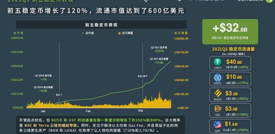 信息來源:CoinGecko-2021-Q1-Report此外,由于監管原因,很多國家并不支持法幣和加密貨幣的直接交易,穩定幣就成了聯通傳統世界和加密世界的中轉站,而對于那些想要避免市場波動的用戶,穩定幣也是他們兌換的第一選擇。盡管穩定幣作為交換媒介、外匯替代品的功能早已有之,且市場規模一直穩步增長,但是穩定幣的真正爆發起始于2020年的6,7月。而穩定幣最為狂飆突進的時期乃是在今年的一季度,根據CoinGecko的報告統計,市場上前5大穩定幣的市值在一季度增長了將近120%。而如今穩定幣市場的總規模已經來到了1150億美金,這個數據是去年同期水平的10倍左右。