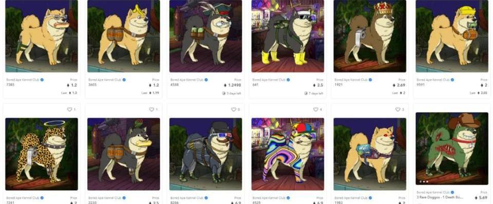 BYAC均價與最低價情況,來源:DuneAnalytics猿猴頭像是BYAC社區的「身份證明」。BAYC的社區氛圍非常濃厚,Twitter或者是Clubhouse會出現Ape猿猴頭像的用戶互相follow的情況,在Clubhouse的某個NFT主題房間中,甚至可以看到Speaker全部使用Ape猴子的頭像,像是一個Ape持有人的Club。有許多名人也將自己的社交平臺頭像換成了Ape,比如NBA球星LaMeloball、余文樂、吳建豪等。此外BAYC也在TheSandbox中購買了土地,專門設立了BAYC俱樂部,成員們可以在Metaverse中互動、社交。另外BoredApeKennelClub也由該項目衍生出來,BYAC社區成員可以免費得到一只狗狗形象NFT,BoredApeKennelClub的在二級市場的總銷量在七月底也達到了2500萬美金左右,BoredApeKennelClub可以說是BAYC社區成員的福利,下圖展示了兩個項目的部分作品。總結起來,BAYC這類收藏品DAO依靠著身份證明和社區共識構建了活躍而龐大的社區,這種模式是非常有趣的,是基于NFT的前所未有的DAO模式。