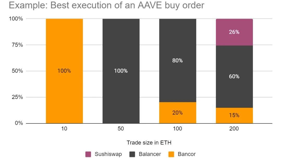 表4:市場價格差異2%內的UNI交易對流動性排序。注意Uniswap和Bitfinex價差的差異。來源:Coingecko關注DeFi以外的市場:雖然這是一篇關于自動做市商的文章,但是我們知道用戶并不總是能夠在鏈上獲取最佳的交易執行。實際上,由于所討論的自動做市商的流動性分布在一個連續的價格區間內,通常很少會有流動性集中在當前市場價格附近。這是許多去中心化交易所都試圖解決的問題。例如Uniswapv3可以讓做市商將其流動性集中在當前市場價格附近,從而提供比中心化交易所更有競爭力的價格。如果有一筆交易改變了去中心化交易所上某個代幣的價格,且該代幣還在其它市場上交易,就會產生套利機會。如上所述,套利者將進行尾隨交易(即在某筆交易后立即插入自己的交易),讓去中心化交易所上的價格重新回到全球市場價格。顯然,套利行為的存在本身就是一種執行不當證明,因為交易者無異于向套利者捐贈資金。這引出了一個問題:其它市場存在的情況下,你是否應該接受超過2%-3%的價格沖擊來執行鏈上交易?注意交易費:自動做市商收取0.3%的交易費,這就意味著最佳買單和最佳賣單之間的價差是0.6%。在這個范圍內,自動做市商不會進行報價。換言之,即使是流動性最好的自動做市商交易也明顯存在0.3%的價格沖擊。盡可能降低交易費是至關重要的,對于在中心化交易所中受到價格沖擊影響微乎其微的交易來說更是如此,因此,完全可以說中心化交易所可能是更好的交易執行平臺。(做個對比,同樣一筆交易的費用在幣安上可能是0.1%,在FTX交易所中可能是0.07%)盡管如此,還有其它原因導致去中心化交易所的成本較高,如全托管、KYC或存款流程等。但即使在這些情況下,交易者也應該意識到較高的交易價格背后意味著去中心化或即時流動性溢價。分散交易:首先,我們可以將一筆交易分解成幾筆較小的交易陸續完成。這點對于更傾向于使用去中心化交易所的交易者來說尤其重要,暫不論DeFi領域之外還存在其它流動性市場。舉個例子,每次買入20%,然后等待套利者恢復價格。這5筆交易的價格沖擊加起來低于一筆大額交易,但gas成本會更高,執行時間也會更長。交易的數額越大,這個策略就越有優勢,因為固定的gas成本隨著更優的邊際執行降低。這個策略也同樣適用于均值反復資產(如穩定幣)。直接交易的成本不一定更低廉:并非每筆交易都存在直接交易對,即使存在,也不一定比使用中間貨幣更便宜。例如,盡管代幣A和B存在直接交易對,但是在A-ETH和ETH-B代幣對流動性更充足的情況下,A→ETH→B的交易路線通常更便宜。從交易路線來看,聚合器的建議非常有幫助。使用去中心化交易所聚合器:最后,你可以使用1inch、Matcha或Paraswap等去中心化交易所聚合器。這些聚合器相當于DeFi領域的智能訂單路由,其運行方式是自動做市商賣出第1個代幣的價格會比第10個代幣低。每當某代幣在多個流動性池中交易時,聚合器會從所有流動性池買入該代幣,盡可能降低每個流動性池的價格沖擊。不同于在一個市場中拉長交易周期,聚合器會在許多可能的市場中分散交易并立即執行。和手動拆分交易一樣,聚合器的gas成本同樣比單筆交易更高。