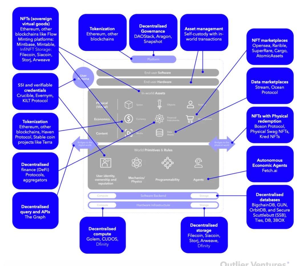 像《頭號玩家》這樣的科幻作品,將"Metaverse"既描述為一個終點,也描述為一個捕捉和控制的反常過程。在《頭號玩家中》:IOI,一個巨頭公司,想要擁有和控制OASIS的服務器和數據庫,在那里他們可以刪除賬號,訪問任何信息,改變世界的規則,并為自己印制無限的貨幣。我們今天在游戲中體驗到的第一個虛擬世界與網絡的相似之處是驚人的:集中化、封閉、專有和采掘,股東至上而非用戶優先。被迫給出你的時間和數據以換取對平臺的"免費"訪問已成為正常現象。隨著我們在平臺上投入更多的時間、數據和財富,我們認為審視他們的設計原則、商業模式和服務條款至關重要,這樣我們才能決定我們是否希望繼續選擇加入或剝離到其他方案中。經過OutlierVentures幾個月的發展,加上我們不斷增長的相關創業公司和合作伙伴網絡,我們已經創建了一個框架來評估和審視Metaverses,以及一個工具包來設計基于用戶中心和身份、數據和財富主權原則的替代品。我們稱之為"開放的Metaverse操作系統",這是一種共享和開放的操作系統,建立在去中心化協議的成功之上,特別是基于區塊鏈和加密資產的Web3Stack中出現的DeFi和NFT。定義Metaverse