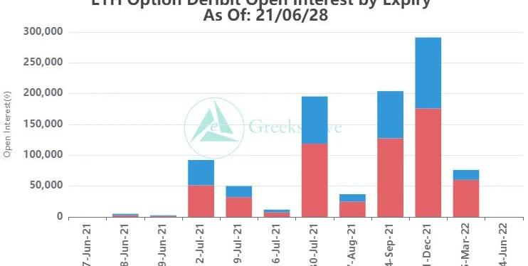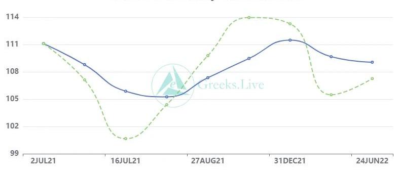 播報數據由Greeks.live格致數據實驗室和Deribit官網提供。在整體成交量下降的背景下,大宗交易異軍突起。比特幣期權當日成交僅為6200幣,而大宗交易就有2000幣,占比高達20%,特別是在今天早上拉盤之前,大宗占比一度達到30%。期權成交量2.06億美元,期權持倉量為42億美元。10d107%30d100%90d94%1Y75%各標準化期限隱含波動率:今日:1m95%,3m95%,6m95%,DVol105%6/27:1m95%,3m96%,6m95%,DVol105%今天早上拉盤至34500美元,回到本輪反彈高點附近,IV還沒有出現明顯變化。