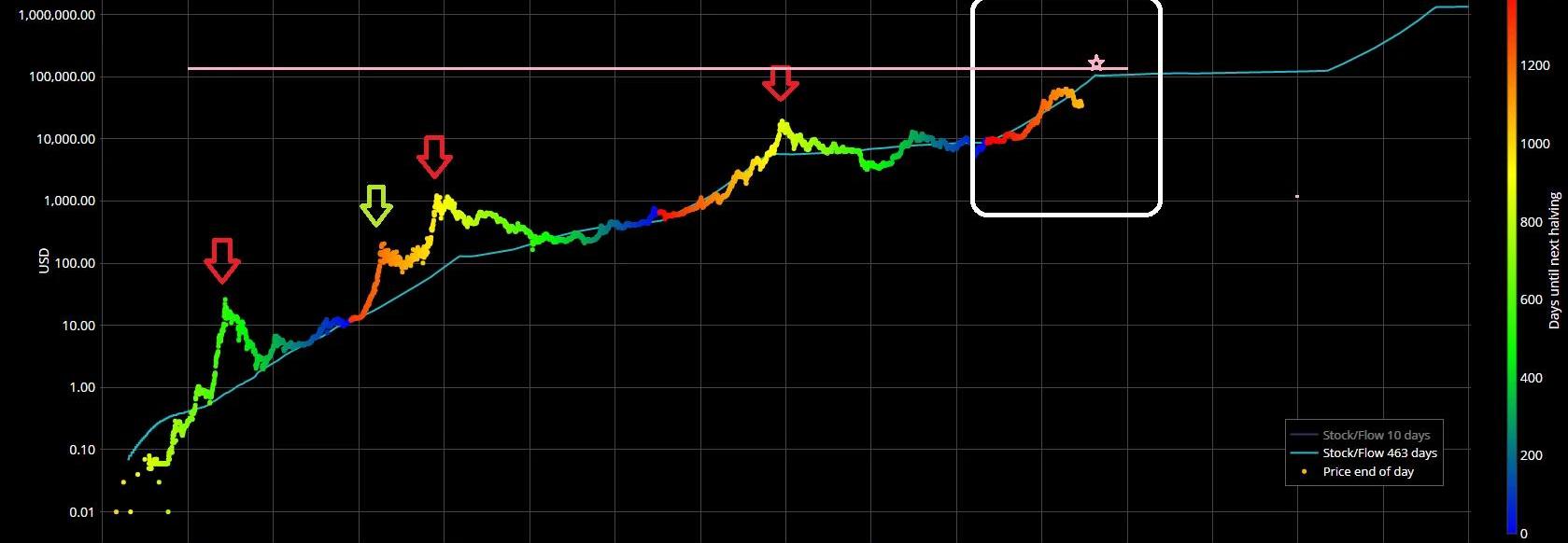 紅箭頭:上一輪牛市的峰值,綠箭頭:次峰值,白方框:我們現在的位置那么問題來了:1、我們能否將64804美元視為本輪牛市的峰值?答案是否定的,原因有二:第一,與之前的走勢不同,這并不像一個陡然增長的泡沫頂峰,而是一個走勢相對平坦的頂部。第二,與之前的牛市行情相比,本輪牛市行情并沒有偏離圖表,遠低于463天的平均S2F值。因此我們在2021年4月14日觸及的峰值可能還不是頂部。