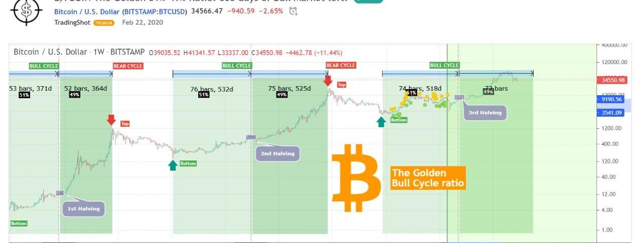 2013年,比特幣減半之后,幣價表現強勁。隨后進入到一個短期熊市,緊接著達到新的高點。2017年,減半后的這段時間,價格呈拋物線形狀,中間經歷4、5次價格修正后,達到高峰。這兩次都非常符合51%和49%的黃金比例。緊接著市場進入下跌-鞏固階段,我們從2018年的低點出發,走過了51%階段,走過了2020年5月的減半,市場一路波折向上,來到2021年6月,然而下圖顯示,距離走完整個49%階段還有幾個月的時間。