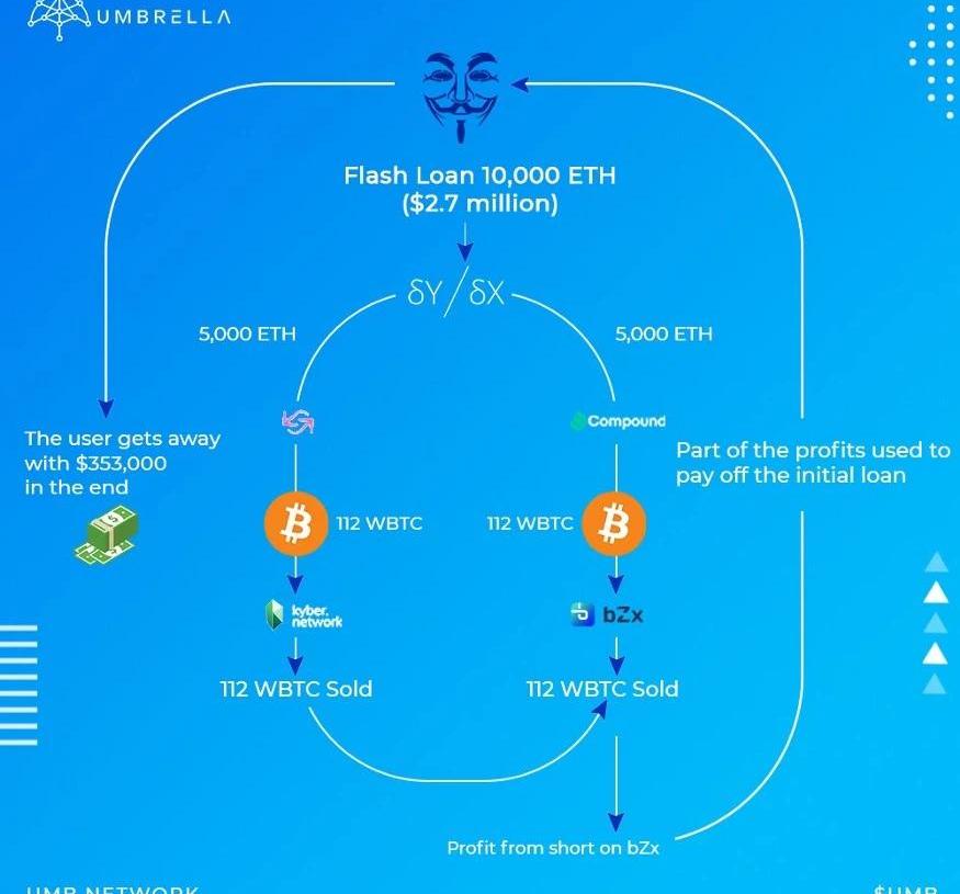 第一次閃貸攻擊發生在2020年,借款人使用DeFi借貸協議dYdX獲得了ETH閃貸。然后,他們將貸款分成兩部分,并將其發送到貸款平臺Compound和Fulcrum。在Fulcrum上,部分閃電貸被用來做空ETH對WBTC。Fulcrum繼續通過另一個稱為Kyber的DeFi協議從流行的去中心化交易所Uniswap手中收購了WBTC。由于Uniswap的WBTC流動性較低,因此資產價格上漲。結果,Fulcrum支付了比平時更高的價格來收購WBTC。