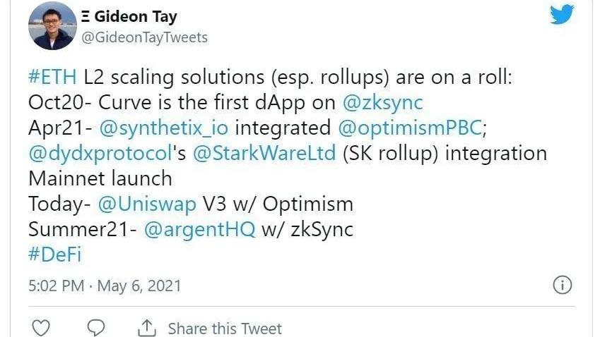 我們將它們稱為非L1擴展解決方案,因為一些解決方案(例如。側鏈)在技術上不是layer2,因為它們沒有被layer1直接保護。以下是一些擴展解決方案的簡要概述:ZKrollup:前后狀態的數據保存在layer1。智能合約在layer2批量進行交易并在layer1更新最終狀態,使用稱為SNARK的密碼證明來證明最終狀態是準確的。Optimisticrollup:與ZKrollup相同,但不是證明每個狀態更新的準確性,而是假定更新是準確的。只有在有人挑戰狀態更新時才通過計算驗證準確性,欺詐者將受到懲罰,挑戰者將因挑戰費用而得到補償。Statechannel:建立各方之間的渠道,形成一個鏈下網絡,在其中進行許多交易。最終狀態在以太坊上更新。側鏈:在獨立的區塊鏈中使用自己的共識機制進行交易。資產和數據通過智能合約與以太坊進行傳輸,智能合約鎖定資產,并在側鏈中重新創建具有代表性的資產。Plasma鏈:類似于側鏈,它作為獨立的鏈具有自己的共識機制。然而,每個區塊的“根”被發布到以太坊,這使得系統更安全,但限制了其進行復雜操作的能力。時間線:主要的dapp都采用了可擴展的解決方案。一些例子: