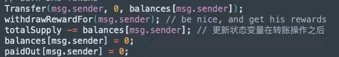 下面的代碼則是進行提款獎勵操作,每次攻擊者調用這項功能時p.splitData都是一樣的,并且p.splitData.totalSupply與balances的值由于函數順序問題,發生在了轉賬操作之后,并沒有被更新。