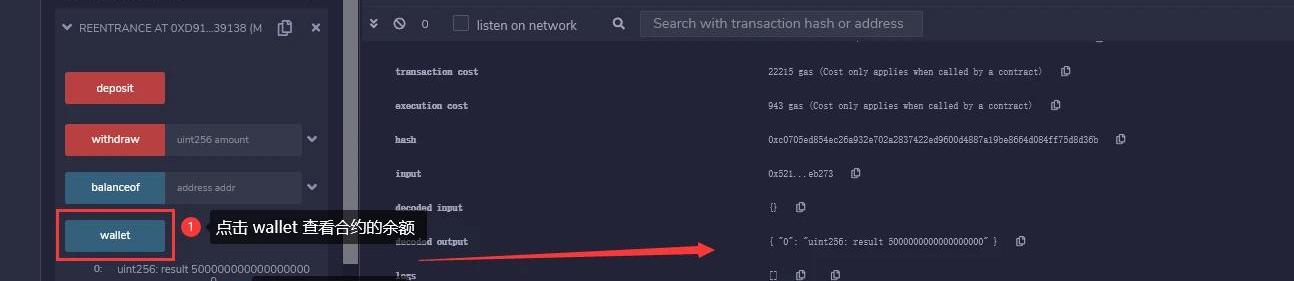 點擊wallet查看該合約的余額,發現余額為5ether,說明我們的存款成功。