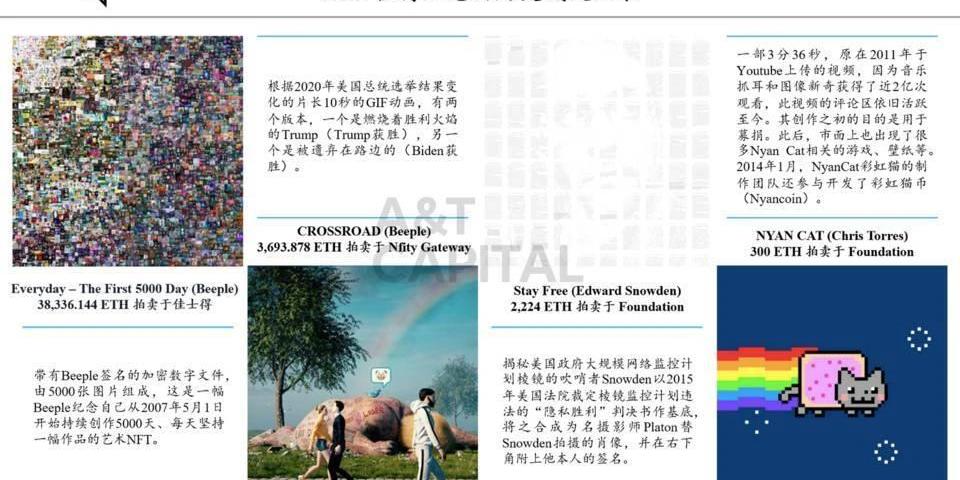 無論是游戲還是藝術品,NFT都可以助其實現從現實通往虛擬的跨越。從藝術家們的數字作品,到職業運動員場上的高光時刻,再到電子游戲中的稀有卡片,越來越多不一樣的目光開始聚焦到NFT的玩法上。而活躍于藝術、娛樂、甚至快餐市場的巨頭們也開始把注意力投入到NFT市場上,如佳士得開始拍賣NFT藝術品、NBA合作推出TopShot、迪士尼和TacoBell也陸續推出周邊電子收藏品。但NFT的發行并不止限于擁有龐大粉絲基數的專業玩家,由于NFT市場本身極廣的受眾面,人們也可以把任何他們認為有獨特價值的資產變成無需許可的區塊鏈可編程資產,并通過NFT平臺鑄造屬于自己的NFT,被發現進而進行拍賣。自2020年8月再度爆發,NFT成為不容忽視的賽道隨著NBATopShot去年8月公測,憑借NBA強大IP,帶領NFT迅速爆發。根據Coingecko數據顯示,截止到2021年6月10日,NFT整體市值已超過為170億美元,約占整個加密貨幣市場市值的1%,而去年8月之前,NFT市場幾乎小的可忽略。從NFT市場歷史交易額看,根據nonfungible數據統計,2021年第一季度NFT市場交易呈現出歷史性高活躍度,并于5月第一周錄得1.73億美元歷史最高的周交易量。雖然目前NFT交易量略顯頹勢,但已成為不可忽視的賽道。下圖介紹了NFT市場上幾幅值得注意的藝術品,前兩幅作品由美國圈內知名圖形設計師Beeple創作,分別是NFT歷史最高交易紀錄的第一名和第四名。第三幅作品StayFree的發行者的是NSA棱鏡門揭秘者Snowden本人發布的,隨后他將拍賣所得的收入全數捐給了版自由基金會。而第四幅作品NYANCAT則是由一段十年前風靡網絡的視頻由來,隨后衍生成了如游戲和加密貨幣等項目,也象征了流媒體在數字世界的生命力。