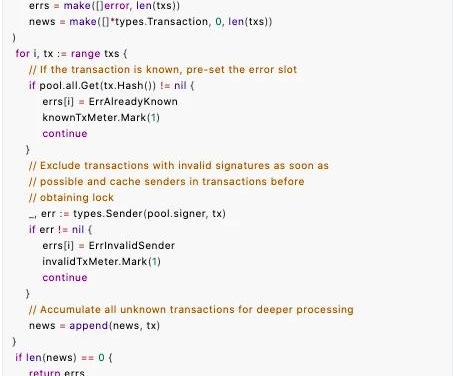 交易降級是指當出現新的區塊時,已被打包的交易將從padding中降級到queue中,或者當另外一筆交易的Gasprice更高時則會從padding中降級到queue中,降級操作的關鍵實現函數為demoteUnexecutables,交易降級主要出現在以下三種情況中:分叉導致Account的Nonce值降低:假如原規范鏈A上交易序號m花費了20,且已經上鏈,而分叉后新規范鏈上交易序號m未上鏈,從而導致在規范鏈上記錄的賬戶的Nonce降低,這樣交易m就必須要回滾到交易池,放到queue中去;分叉后出現間隙:這種問題出現通常是因為交易余額問題導致的,假如原規范鏈上交易m花費100,分叉后該賬戶又發出一個交易m花費200,這就導致該賬戶余額本來可以支付原來規范鏈上的某筆交易,但在新的規范鏈上可能就不夠了,這個余額不足的交易如果是m+3,那么在m+2,m+4號交易之間就出現了空隙,這就導致從m+3開始往后所有的交易都要降級;分叉導致pending最前一個交易的nonce值與狀態的nonce值不等。demoteUnexecutables代碼如下所示,在這里首先通過遍歷pending列表來獲取每個addr的最新Nonce值,之后刪除Nonce小于之前查詢所得Nonce值的交易,之后返回賬戶余額已經不足以支付交易費用和一些暫時無效的交易,并將暫時無效的交易放到queue中,此時如果有間隙,則將后面的交易移動到queue列表中,如果經過上面的降級,如果pending里某個addr一個交易都沒有,就把該賬戶給刪除: