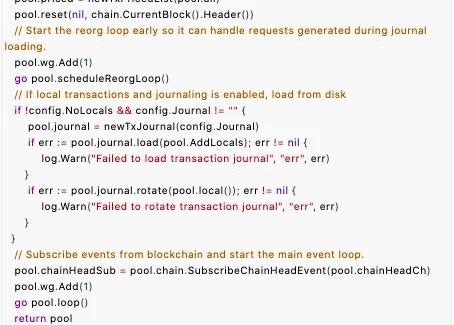 主循環loop具體實現代碼如下,它是txPool的一個goroutine,也是主要的事件循環,它主要用于等待和響應外部區塊鏈事件以及各種報告和交易驅逐事件:
