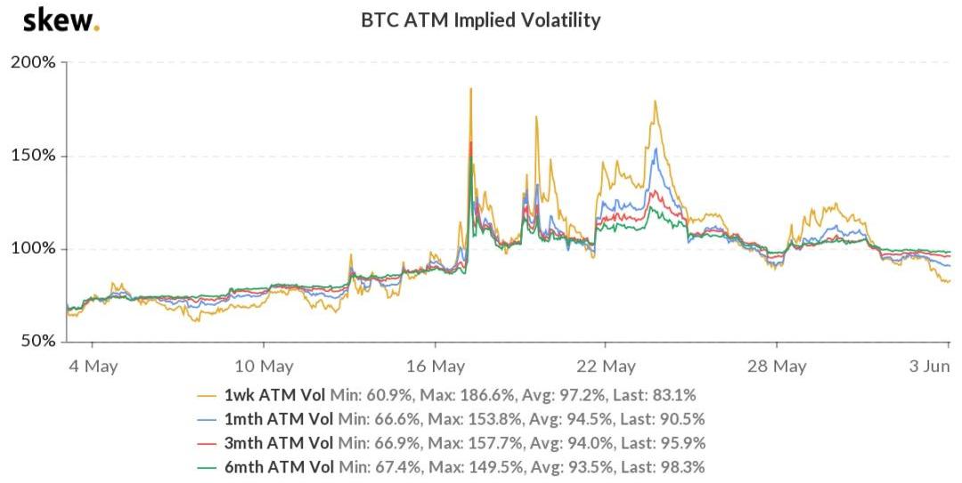 播報數據由Greeks.live和Skew.com提供。市場經歷了12日,19日和23日三次大幅下跌后,市場情緒比較悲觀,Skew一度從明顯負偏轉為明顯正偏,虛值Put的價格快速上升。隨著近兩周市場走勢趨于平穩,監管也釋放出偏溫和的消息,市場情緒緩和,Skew回歸至零軸附近。期權成交量7.23億美元,期權持倉量為59億美元。10d98%30d118%90d86%1Y73%各標準化期限隱含波動率:今日:1m87%,3m92%,6m96%,DVol100%6/3:1m90%,3m95%,6m98%,DVol102%比特幣走勢平緩了許多,日線級別看現在的整理非常規整,中短期IV基本上是勻速下降,Skew均回到15%以下,虛值Call的價格變動并不大,虛值Put的價格下降的很快。