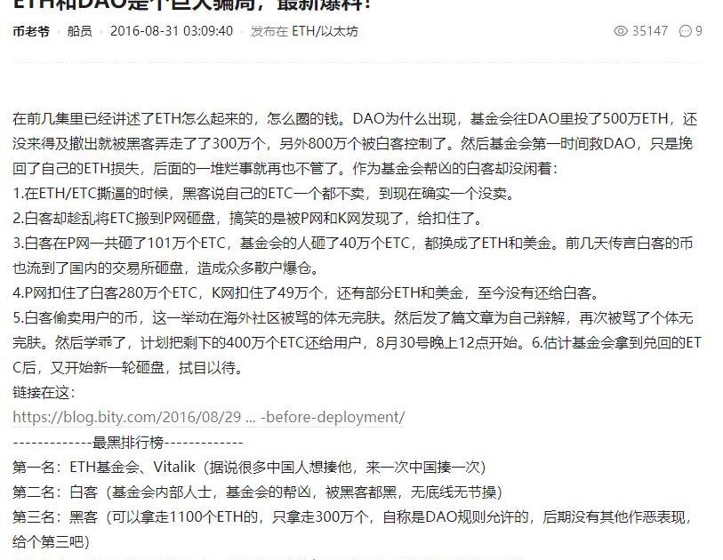 其中黃線代表兌換比特幣的價格,綠線代表兌換美元的價格。可以看到的是,以太坊曾經達到比特幣價格的0.15,本輪牛市的高點為0.07,相比比特幣,跌了近2倍。而在兌美元的價格上,0.15比特幣的價格在兌換美元時只有388美元,而本輪牛市的高點確是4000美元,漲了接近10倍。以太坊一開始值多少錢?我們來回顧一下以太坊的成長歷程。2014年8月,由天才少年VitalikButerin發起了以太坊項目,并公開籌集資金,為期42天,目標金額為1970萬美元,分為3個階段進行。在第一階段的14天里,以太坊與比特幣的兌換比例為2000:1,不過隨后兌換比例降至1337:1,最終,共募資31000枚比特幣,售出6千萬枚以太坊,以當時的匯率,約合1840萬美元,單價在0.4美元左右。根據公示,募集資金的76.5%將用于以太坊平臺和工具的開發和拓展,13.5%的資金將用于社區服務,而剩余的10%資金將會用于支持加密貨幣研究小組的研究。項目發展一開始很不順利,困難和壓力很多。比如,在項目方拿到錢之后,一開始項目一直處于財務極不透明的狀態,外界質疑很多。直到2015年9月,以太坊創始人VitalikButerin在官方博客公開了項目的最新進度。而團隊籌措的比特幣趕上大熊市,虧損嚴重,開發出現資金壓力,甚至開始裁員。在項目正式上線后的一兩年時間里面,整個互聯網上罵以太坊是騙局的聲音非常多。很多文章從各個層面分析以太坊是騙局的特點,比如2016年幣老爺曾在巴比特連續寫了多篇文章,“揭露”以太坊是一個巨大騙局。