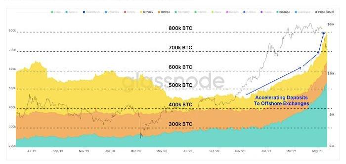 上圖展示了加拿大比特幣交易所交易基金PurposeBitcoinETF的資金流入走勢變化。從灰度比特幣信托基金和加拿大比特幣交易所交易基金PurposeBitcoinETF的資金流入走勢可以看出,機構需求從2021年2月至5月有所減弱,這兩個基金都對比特幣流動性供應產生了影響。從積極的方面來看,隨著灰度比特幣信托基金不再以折扣價銷售、PurposeBitcoinETF資金流入量出現反彈,似乎表明最近市場價格下挫似乎“刺激”更多投資者重新購買比特幣。2021年5月數字貨幣交易所動態