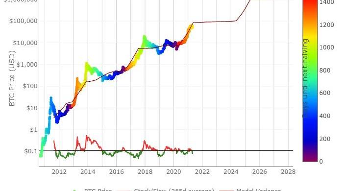 當了解完經濟學上的定義,BTC-S2FModel背后的想法便一目了然了——將比特幣視為與黃金、白銀這類價值儲藏品具有可比性。流通到市面上的黃金大致需要經歷六個環節:勘探、采礦、選礦、冶煉、加工和銷售,其中勘探、采礦和選礦三大環節便費時且耗費巨大成本。從供給端的角度來說,即很難大規模地增加其供應量。比特幣也是非常類似地,其供應量有上限以及獨特的減半機制,每4年比特幣產量減半一次,挖到2140年,2100萬枚比特幣全部開采完畢。并且挖礦還需要耗費大量的電力和計算力。這讓比特幣成為可以和黃金比擬的價值儲藏品,因為它們都具有相對稀缺性。隨著比特幣的稀缺性不斷增加,其價格也會隨之上漲,這是PlanB所創建的BTC-S2F模型最核心的原理。基于這條原理下,PlanB收集了2019年過往十年的比特幣月度價格數據,并用線性回歸的方式,以SF值的自然對數作為自變量,比特幣價格作為因變量,對整理提取的數據進行擬合,發現了SF值與市場價格具有正相關的關系。然后再結合比特幣減半周期進行擬合調整,形成了我們大家所熟悉的S2F模型,并用此模型作為對比特幣價格的預測。基于BTC-SF值作為對比特幣價格的預測結果BTC-S2FModel,如下圖顯示: