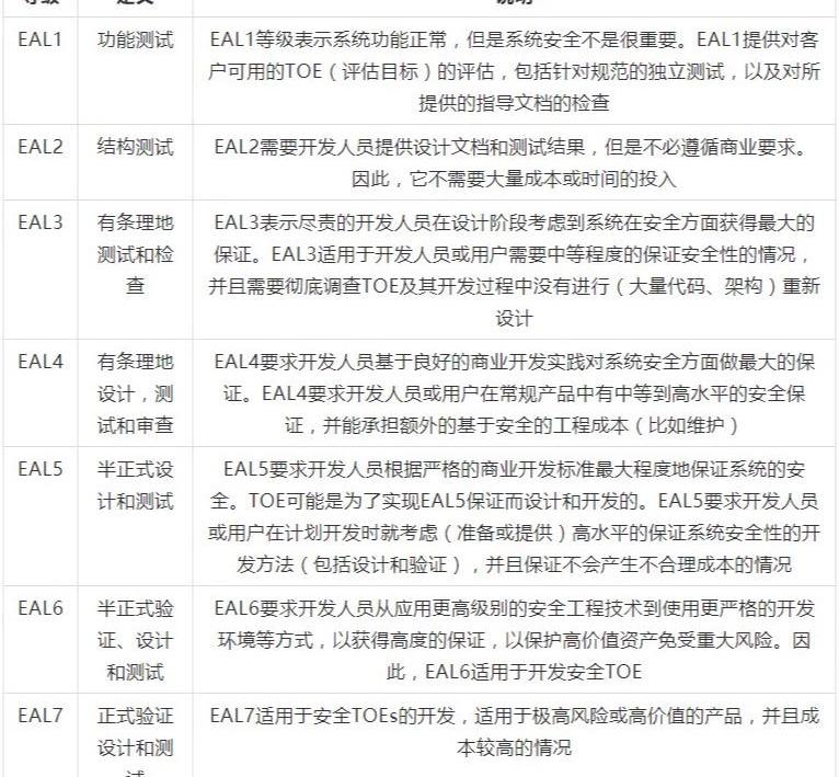 硬件錢包主要功能是生成、保存私鑰,同時還能對用戶的交易進行簽名驗證,而完成這一切的核心,便是錢包安全芯片。錢包安全芯片保存了我們的私鑰,當需要對交易進行簽名時,通過調用芯片接口,把需要簽名的數據傳輸給安全芯片,安全芯片返回簽名后的數據,實現了在不對外暴露私鑰的情況下,完成交易簽名,從而保證了私鑰安全。所以錢包芯片的安全等級,直接決定了整個硬件錢包的安全系數。對于安全芯片的安全等級評測,國際上公認的標準是CC標準,CC標準對安全保障等級,規定了七個級別: