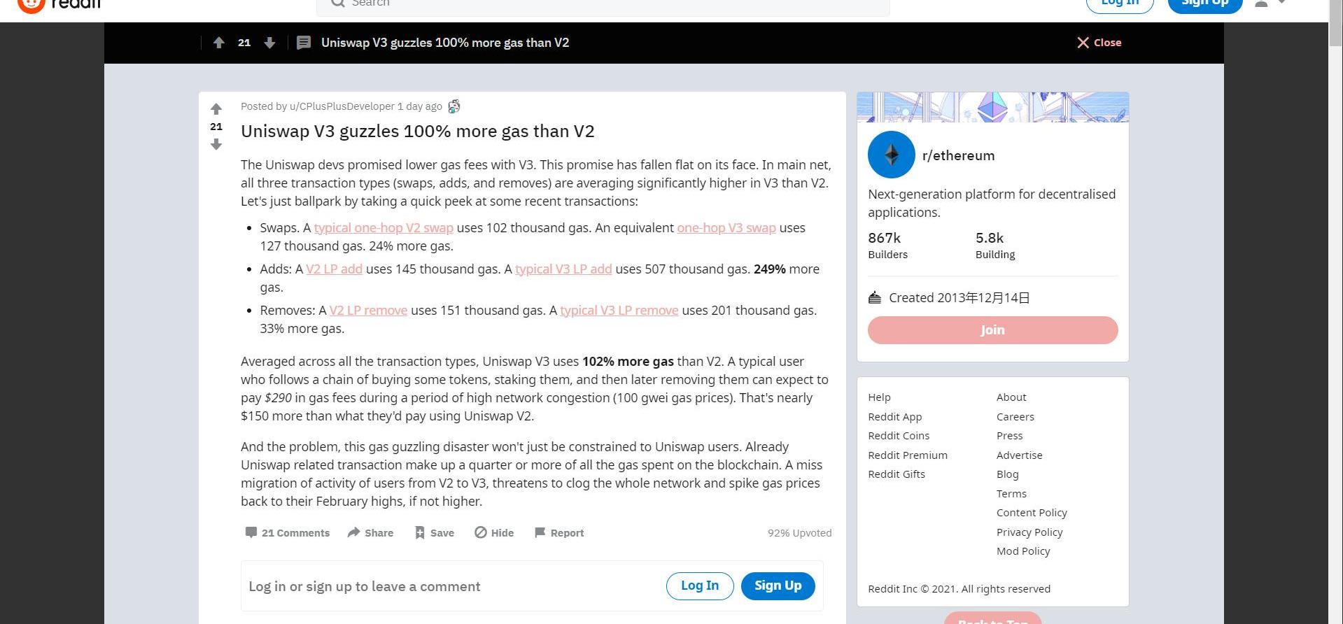 粒度控制,就意味著增加了交易的復雜性,必然會導致Gas費的增多。在V3版本上線后,很多人吐槽V3的操作成本過高。CPlusPlus開發人員在Reddit上表示:“UniswapV3所承諾的降低GAS費已經落空,在UniswapV3主網中處理事務的費用遠高于V2,平均消耗費用比V2多102%。”雖然看上去全網都在抱怨UniswapV3手續費過高的問題,但從首日交易額表現上來看,UniswapV3“集中流動性”的創新措施還是為它帶來了不俗的市場反響。