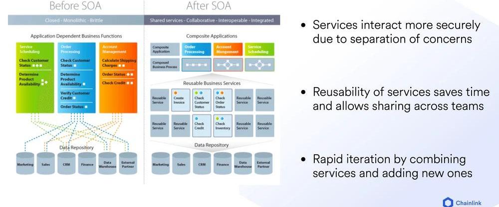 面向服務的基礎架構是一種軟件設計方法,通常會開發多個獨立維護的組件或“微服務”,并組合成一個應用。將服務分割成模塊化的組件可以加速創新,并縮短開發周期。這種模式推動了DeFi生態不斷創新和發展,將多個無須許可的開源協議組合在一起,打造出全新的金融應用。說到DeFi模塊化,其核心就是智能合約的SOA架構。Chainlink的聯合創始人SergeyNazarov最近談到了Chainlink網絡如何推動區塊鏈生態SOA架構的發展,為智能合約應用提供可靠的微服務,比如安全的喂價、可驗證的隨機數、儲備金證明以及其他鏈下計算。Chainlink預言機可以為智能合約提供安全的數據基礎架構,并且為許多傳統企業的后端系統連接至蓬勃發展的智能合約經濟,將去中心化的微服務集成至企業商業模式,以便更好地在市場中展開交易。本文節選了Sergey在2020年CoindeskInvest:Ethereumconference上的發言,題為《模塊化DeFi智能合約的巨大價值》。面向服務的基礎架構具有哪些優勢?