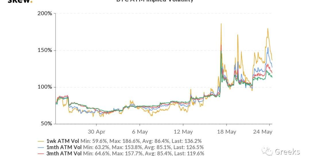 播報數據由Greeks.live和Skew.com提供。昨晚數字貨幣的行情非常危險,比特幣期貨一度跌破30000美元,以太坊一度跌破2000美元,因為下方沒有明顯的支撐,如果昨天關鍵點位守不住,行情繼續下跌引發DeFi的連鎖反應,后果將十分嚴重。今天的市場盤面強勢反彈,主流幣很多反彈了了20%。還是昨天那句話,數字貨幣市場是一個聯動的整體,一榮俱榮,一損俱損。期權成交量5.2億美元,期權持倉量為61億美元。10d142%30d113%90d87%1Y72%各標準化期限隱含波動率:今日:1m126%,3m119%,6m112%,DVol150%5/23:1m124%,3m117%,6m112%,DVol140%昨晚數字貨幣的行情非常危險,比特幣期貨一度跌破30000美元,在今年上一輪暴漲的回調中,比特幣也只下降到30000美元一線。比特幣今天是明顯的反彈,但成交量不大,承受下行壓力仍然較大,目前市場是比較脆弱的。