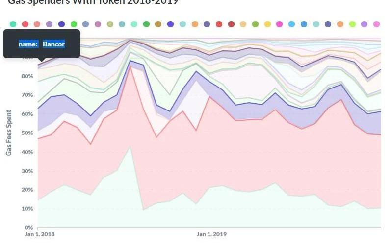 除了實體之外,我們還匯總了代幣合約支出的gas總費用,代幣合約大約占據了以太坊活動的10%左右。2018年,許多代幣合約都是龐氏騙局和賭博游戲,其中相當一部分來自中國。比如LastWinner就是一個典型例子,該協議只是基于一個非常簡單的機制:用戶將ETH存入合約,直到達到某個ETH上限,一旦觸及,那么最后一個存入ETH的人將贏得全部ETH,你可以看到這個協議在以太坊上的活動在2018年中旬達到高峰。下面這張圖更有趣,其中展示了自2018年至今,排名前三十的實體所花費的gas相對比例,數據來源Metabase。