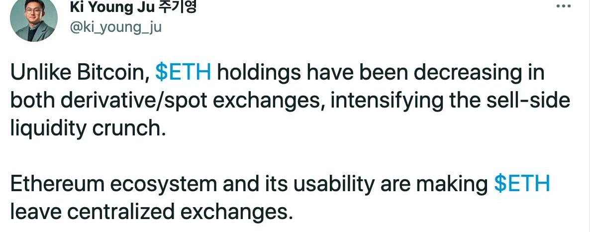 3、歐易CEOJayhao:抓住結構化機會投資,將成為加密市場新常態5月13日,歐易OKExCEOJayHao微博表示,從各種經濟信號來看,全球經濟仍然處于一個通脹上行階段,這導致人們手中的錢在不斷貶值。如何實現財富的保值增值,成為當下每個人需要考慮的重要問題之一。因此,實現金融資產的合理配置,是必然的選擇,要把握的是結構性機會,而不是盲目撒網。面對加密市場,Jay表示,近期,比特幣價格一直在5萬美元-6萬美元區間徘徊,而諸如YFI,DOGE等資產價格卻出現了翻倍的情況;同時,比特幣也在2.6萬億美元加密市場總市值中份額從2021年初約70%降至43%,這說明更多價值洼地開始崛起,將資金按不同比例分配將成為投資加密市場的趨勢。主流資產后市方向短期雖暫不明確,但長期來看,多元化的企業級投資仍是市場的強支撐,關注結構化機會,我相信這是經歷幾輪牛熊市后的價值共識。YFI、DOGE、DeFi、Layer2、波卡平行鏈競拍,都屬于結構化機會,但作為普通投資者很難一次性抓住所有的機會,專注某一兩個領域或許才是王道。4、CryptoQuantCEO:ETH交易所持有量減少,加劇賣方流動性緊縮5月12日,CryptoQuant首席執行官KiYoungJu發推稱,與比特幣不同,ETH在衍生品/現貨交易所的持有量都在減少,加劇了賣方的流動性緊縮。以太坊生態系統及其可用性使得ETH離開了中心化交易所。ETH正在超越BTC的路上越走越遠,正如加密評論人士所分析的那樣,機構通過比特幣認識了加密貨幣的價值,然后又發現了更有價值的以太坊。