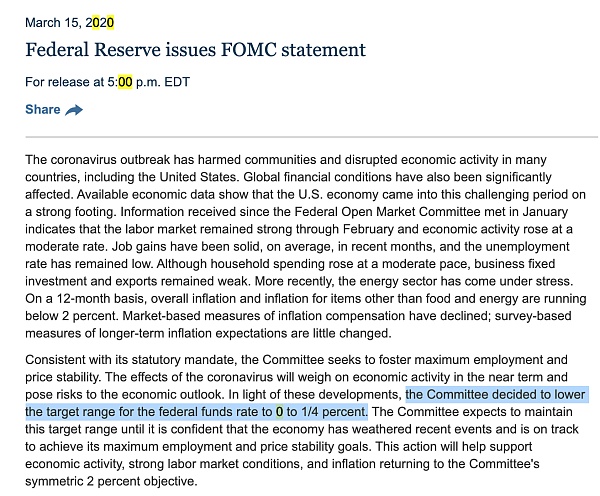 美國東部時間3月15日下午,美聯儲臨時緊急開會宣布實行零利率,即把聯邦基金利率的的目標區間從1%-1.25%降到0%-0.25%,承諾維持零利率直到經濟改善;同時宣布重啟QE計劃,推出規模為7000億美元的資金購買國債和房產抵押債券,并表示準備用各種手段穩定金融市場的流動性。